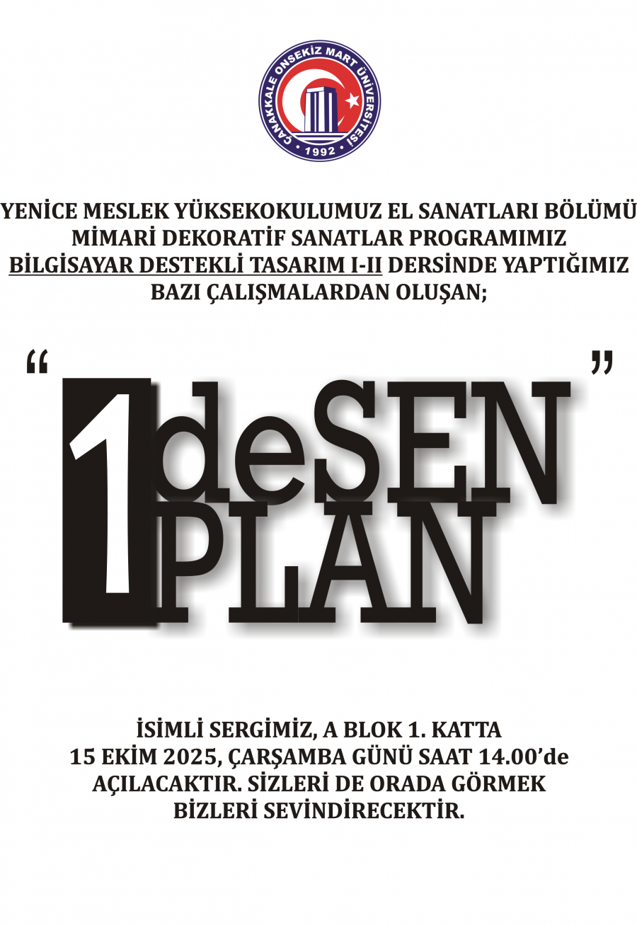 El Sanatları Bölümü, Mimari Dekoratif Sanatlar Programı, Bilgisayar Destekli Tasarım I-II dersinde yapılan bazı çalışmalardan oluşan "Bir DESEN, Bir PLAN" sergisi 15 Ekim 2025, çarşamba günü saat 14.00'den itibaren görülebilecek. On gün açık olacak sergideÖğr.Gör. Mehmet Engin ÖZEN kontrolünde, tasarım programlarında tekrar hayat bulan geleneksel motiflerle, okulumuz ve okul dışındaki bazı mimari yapıların rölöve çizimleri yer alıyor.